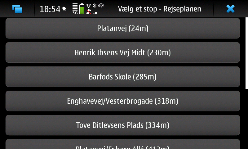 Thanks. I'll look into it. And release an updated version soon (maybe later tonight). API: Rejseplanen doesn't really have an API. All you get is a downloadable list of all stops in Denmark with their names, Rejseplanen IDs and position. I parsed the data file, changed the crazy position format into lat,long and saved it into a database, which i access via a web service I made (in lack of an official web service from Rejseplanen). The time tables my app gives you is just the web page at Rejseplanen launched in the browser. There are also pages for planning, which I also want to make accessible via the app (travel to/from a stop) in the next minor version, along with favorites (and maybe find-as-you-type). It seems like they don't really want to provide an API, as they are scared of the fact that they can't control the quality of the stuff people create from it. Instead everybody doing something with their data has to download an updated version of their data file every month. It's a silly way to do it, I think. And they still don't have any control of the quality of these unofficial products. |