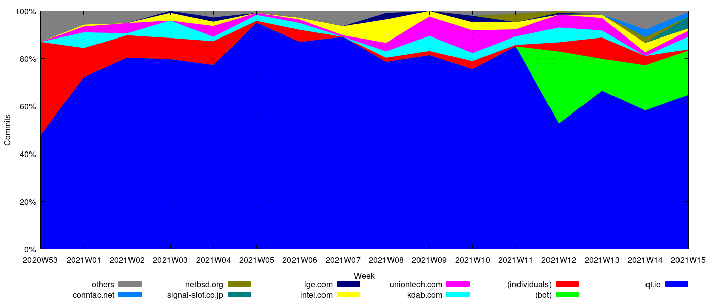 There are a large number of people (and that number is growing) who are not paid by Nokia to work on Qt (disclaimer: I'm one of them). If you look at qtbase (where those numbers are the highest), then Nokia contributions account for around 60% of the total activity. This isn't so much because Qt development has been slowing down (though it has lately, with the push towards 5.0 release), but because a lot of other people have been pushing their work forward. http://www.macieira.org/~thiago/qt-s...r.relative.png Take a look at the other stats on http://www.macieira.org/blog/qt-stats/. tl;dr, don't worry, everything will be fine, thanks to Jolla, and other companies/individuals interested in the future of Qt. But by all means, come contribute. |